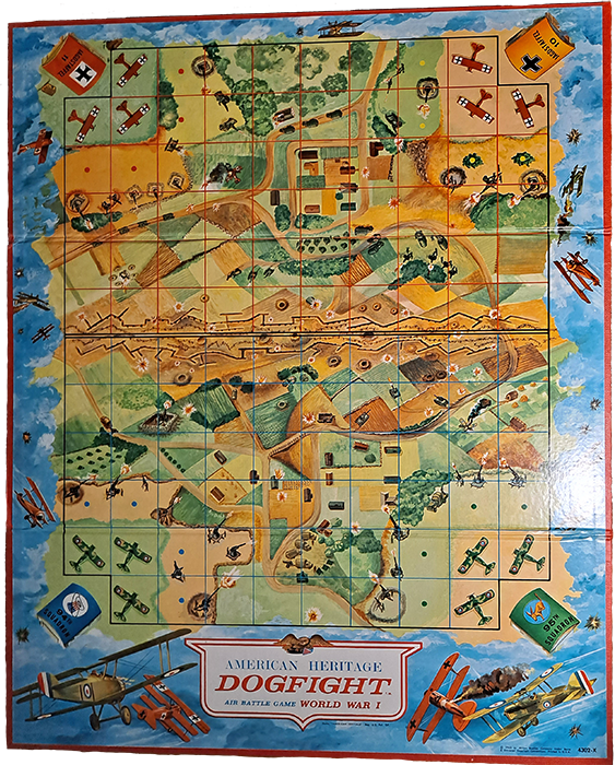 The gameboard is detailed and provides a nice background for the aerial battles. The model planes are placed in each corner with anti-aircraft disks placed on the dots around the planes. There are two hits and two misses. If you decide you want to attack the planes on the ground, you must fly over the anti-aircraft discs and take a 50-50 chance of getting shot down.