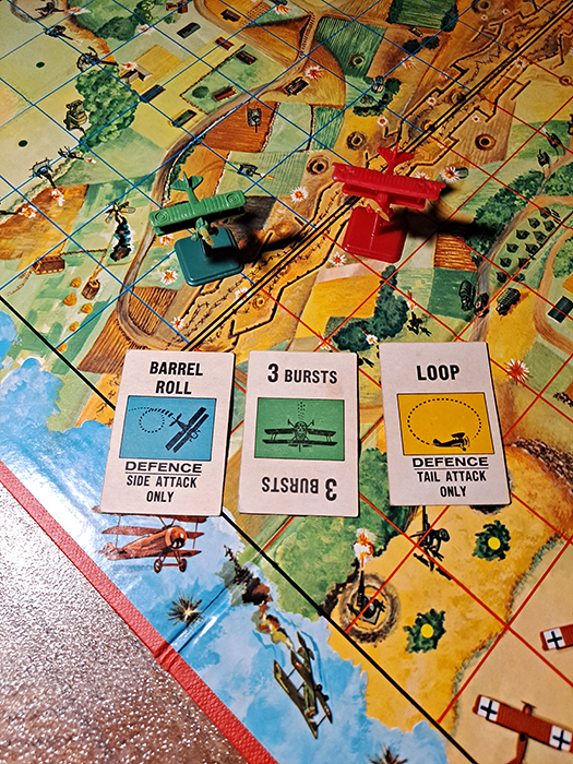 Shown here are two planes and cards set on the board. In a dogfight, the highest burst wins. If you are attacked from the side, you need a barrel roll card to escape. If you are attacked from behind, you need a loop card to escape.