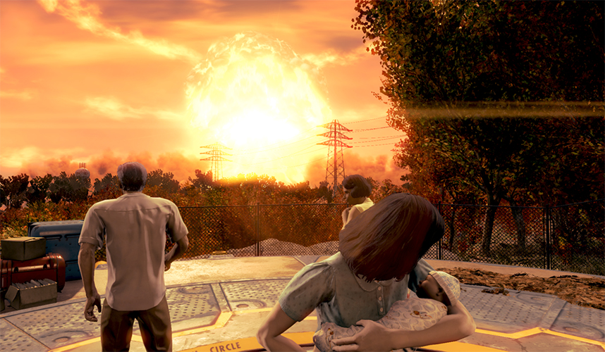 When the attack comes, the family runs to the Vault facility. They are at the elevator to the underground facility when the nuclear bomb goes off.