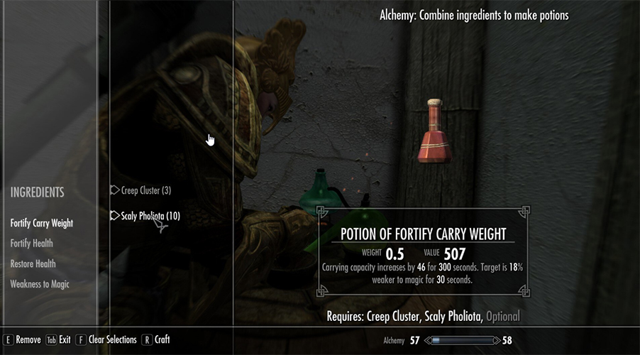 Another important potion is the fortify carry weight potion. As your character defeats enemies, the dead can be stripped of their armor and weapons. Your character can also kill animals for their pelts and use those pelts to make leather. Your character can only carry so much weight and the fortify carry weight potion can increase the amount your character can carry. Your character uses an alchemy station to make potions.