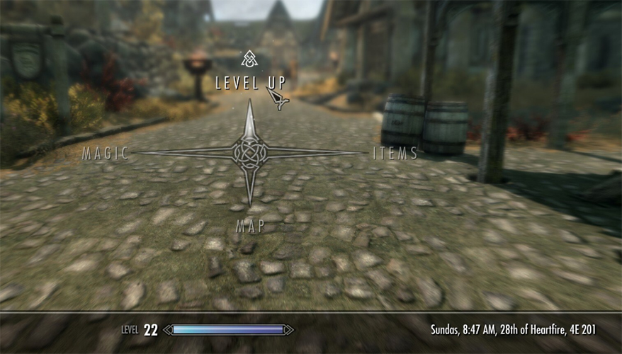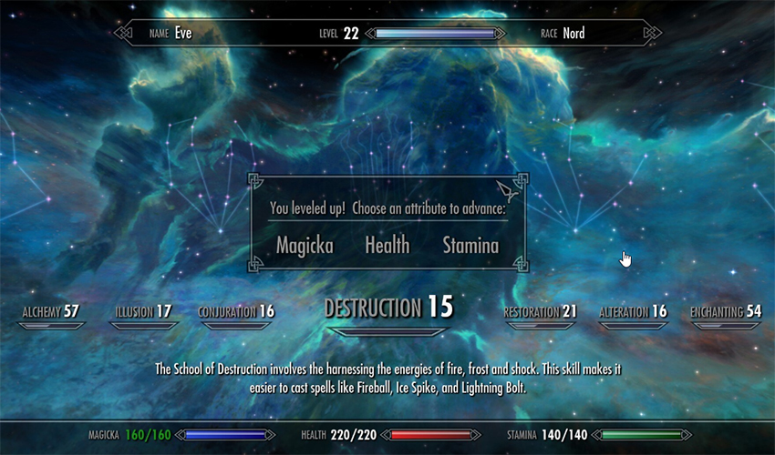 Your character can gain experience points during battle or by using the alchemy or enchanting station or by forging weapons and armor. As you create new items, your experience in each skill goes up and when that skill reaches a new level, your character's level points increase. When the character's level points fill up the current level, the character can level up.