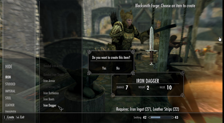 The next most important skill is Smithing which is used to make and enhance armor and weapons. Although armmor and weapons can be bought, it is much better for your character to make their own. The simplest armor is made from leather. The next step up is using iron ore to make iron ignots at a smelter and then using those iron ignots with leather and leather straps to make armor and weapons such as the iron dagger.