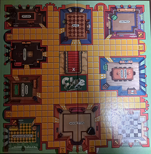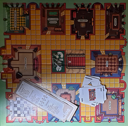 There are cards for each suspect, weapon, and room. These are separated into categories, shuffled, and one suspect, one weapon, and one room card are placed into an envelope before the game starts. The remaining cards are shuffled and dealt out to the players. The players move Their tokens to rooms on the board and make a guess as to who did it, what weapon was used, and must choose the room where their token is located. The other players must show the card secretly to the player making the guess if they have either the person, weapon, or room card. However, they are only required to show one card. All players maintain a sheet marking off the cards in their own hand and any cards shown to them during their guesses. When the player is sure they know the person, weapon and room, they make an accusation and look at the cards in the envelope. If they are correct, they win. Otherwise they lose and the rest of the players keep guessing with the losing player still showing cards in their hand during guesses.
