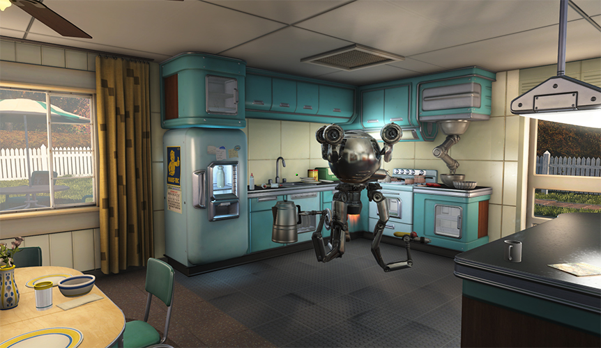 Fallout 4 is a post-apocalyptic game where the player builds skill levels and weapons and tries to survive in bombed out cities and remote wastelands. The game starts where technological marvels are commonplace, but overuse of resources has led to a global conflict. Here is an image of Codsworth, the family's robotic butler/nanny before the disaster strikes.