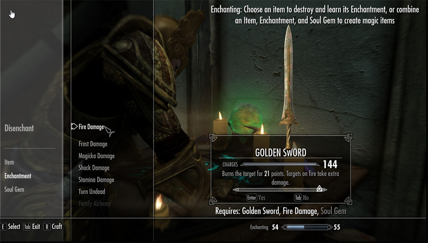 One way to enhance armor and weapons is to use an enchanting station to place an enchantment such as fire damage on a weapon.